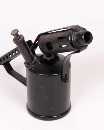 This authentic vintage blow torch is a captivating piece of industrial heritage, perfect for adding a touch of rustic charm to any space. Crafted from sturdy black metal, it showcases a distinctive design featuring a robust cylindrical tank, an angled nozzle, and a unique handle with eye-catching cut-out details. The tool bears the beautiful patina of age and authentic signs of wear, enhancing its historical appeal and unique character. While its original function as a working tool has been superseded by its decorative value, it serves as an exceptional conversation starter or a unique display item in a home, workshop, or office. Ideal for collectors of industrial salvage or those seeking distinctive decor.