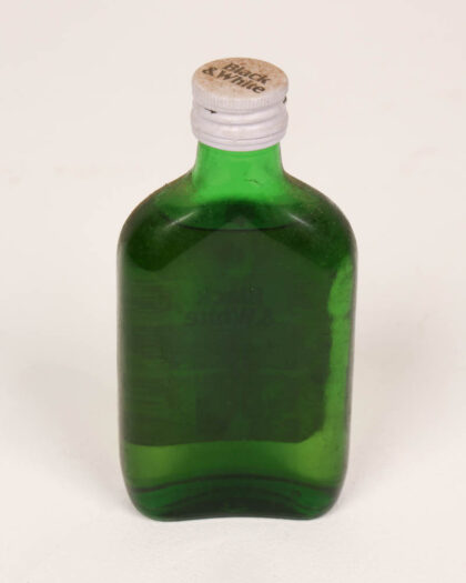 Vintage Black White Scotch whisky miniature bottle. Green glass with original label and metal screw top. Good condition.