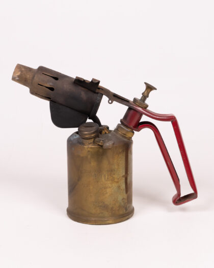 Vintage blowtorch featuring a brass tank and red metal handle. Has patina and signs of use. Perfect for collectors or display!
