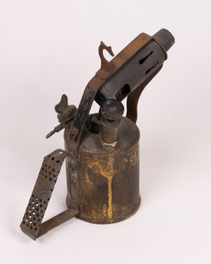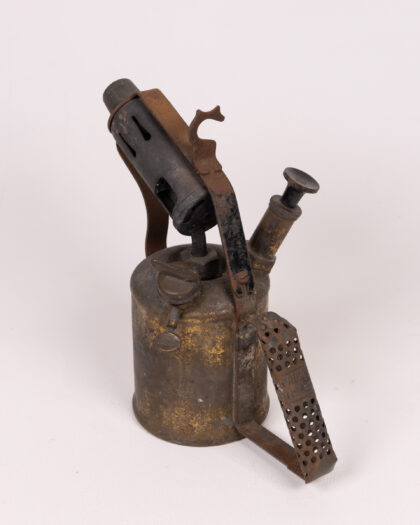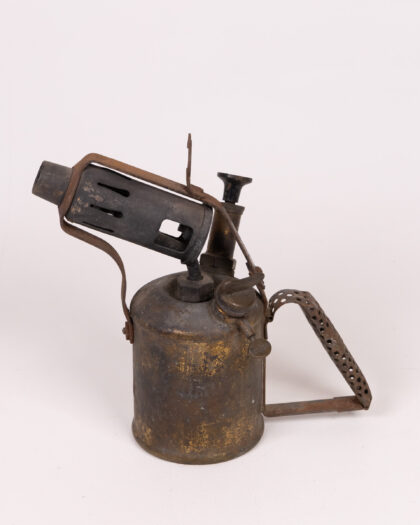 Vintage metal blowtorch with a weathered gold and black finish. A unique collectible or decor piece with signs of age adding to its character.