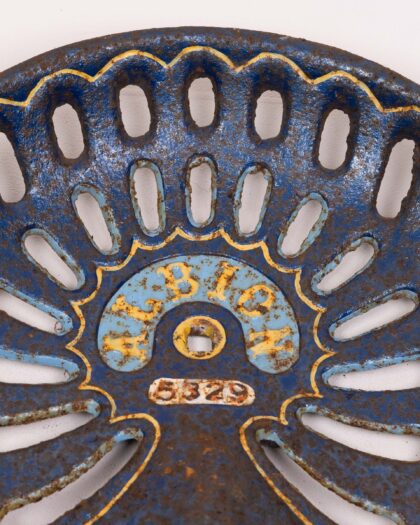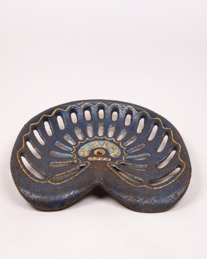Vintage tractor seat with a blue, gold and brown weathered finish. The seat is made of cast metal and has an openwork design. This sturdy tractor seat is not just a piece of agricultural history, it's a unique decorative item. The weathered patina tells a story of years spent in the fields. It could also be repurposed as a quirky stool or decorative item. The seat shows signs of age and wear, with some rust and imperfections, which adds to its vintage charm and authenticity.