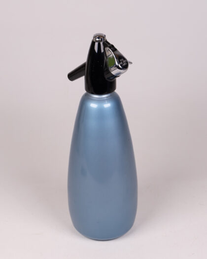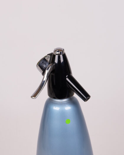 This is a vintage soda siphon, featuring a lovely pale blue glass bottle. The top is black plastic with a chrome nozzle. This is a wonderful decorative item for a kitchen or home bar. There is a small green sticker dot on the side of the bottle. There are some minor scuffs and scratches on the bottle, but nothing significant. Please see images for more details on condition.