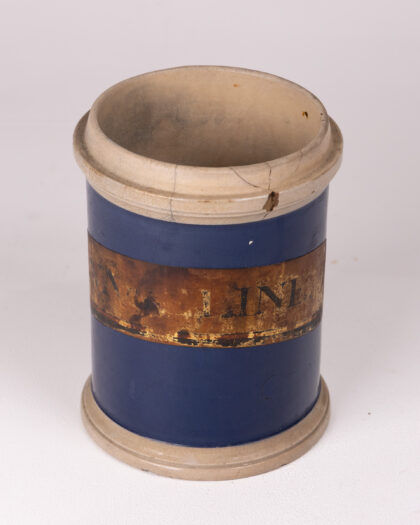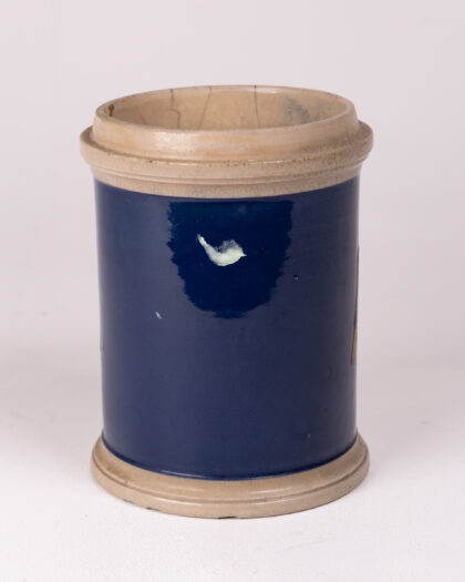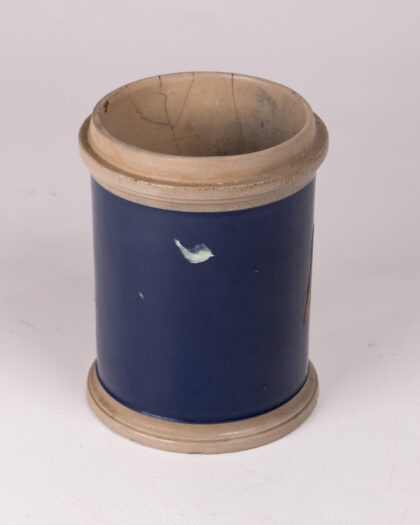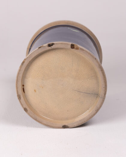 Discover this charming vintage cylindrical ceramic pot, featuring a captivating deep blue glazed finish that evokes a sense of timeless elegance. The pot is beautifully accented with cream-coloured rims at both the top and bottom, complemented by a rustic brown central band that still bears the faded, intriguing lettering of a historical brand or product name. Its authentic age-related wear, including subtle hairline cracks and a small chip, only enhances its unique character and vintage appeal. This versatile vessel is perfect for use as a decorative display piece, a small vase for floral arrangements, or a distinctive addition to any vintage or antique collection. It offers a unique and stylish accent, bringing a touch of history and charm to any home, office, or living space.