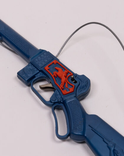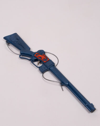 This vintage toy rifle is made of blue plastic with red accents. It features a horse design in the middle and an Indian chief head at the gunstock. There is a wire attached to it. The rifle appears to be in good condition, showing minor wear. This item would be ideal for a kid or to display in a man cave, home bar, or lounge/snug.