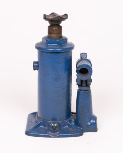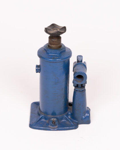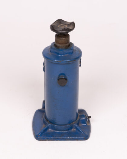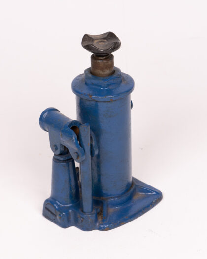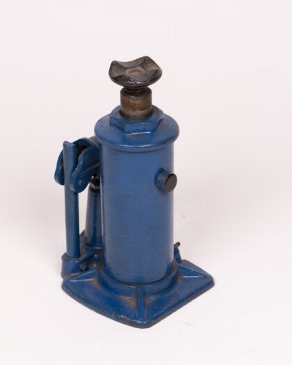 Vintage blue car jack. Steel base, adjustable screw mechanism & swivel head. Sturdy tool or decorative industrial object.