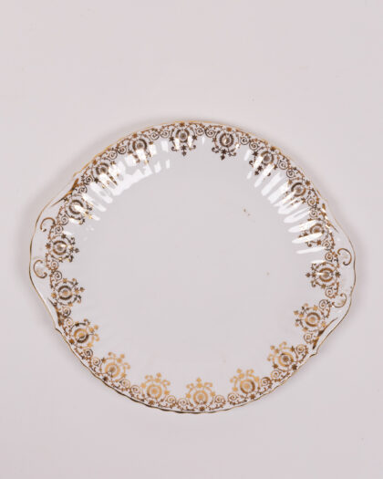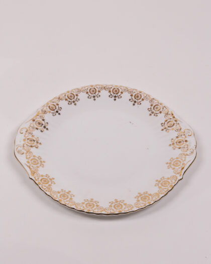 Elegant vintage English bone china oval plate with a delicate gold floral design and scalloped edges. Ideal for display or serving, adding a touch of classic charm to any space.