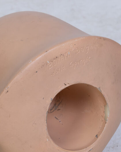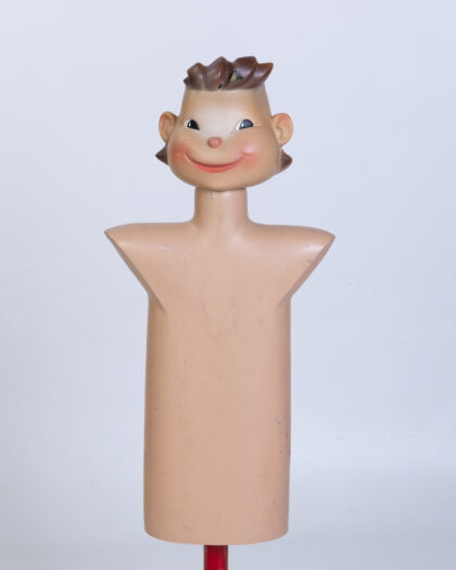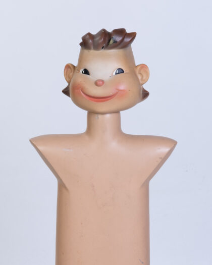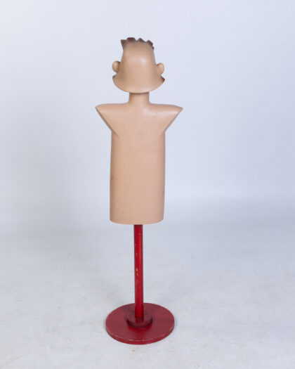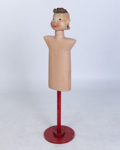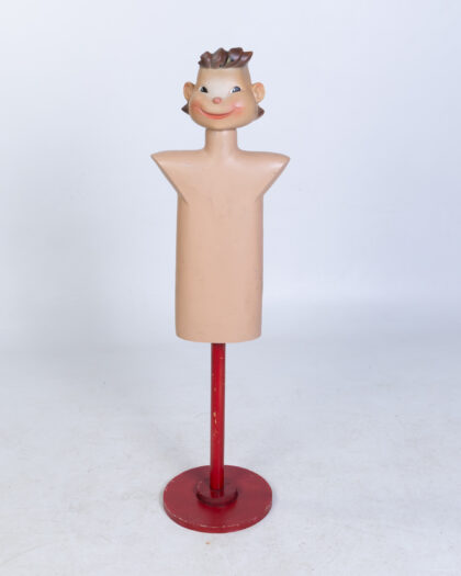 Vintage 'Bonna' Belgium child's mannequin on a red painted wooden base. This display figure is made of a lightweight plastic and has painted features of a young boy with styled hair. The face has charming slightly eccentric features. The body is a smooth shape and has been mounted on a repainted wooden stand. This item is in a used condition and shows some signs of age with scuffs and marks to the plastic and paintwork.