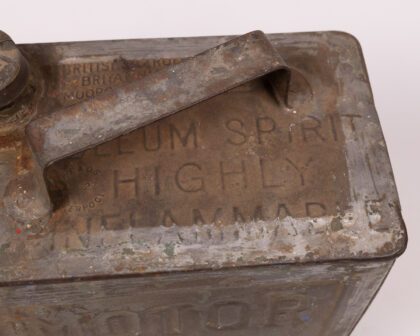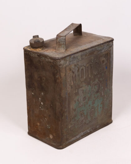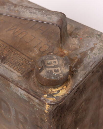 This is a vintage BP (British Petroleum) fuel can, with a visible BP logo on the cap. The can has a handle for carrying and shows its age, with visible wear and tear. The can has tarnished over time, resulting in grey and brown hues with hints of original green and blue. The can features the words 'Motor Spirit Highly Inflammable'. This fuel can is a piece of petroliana.