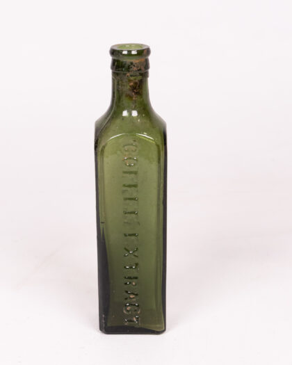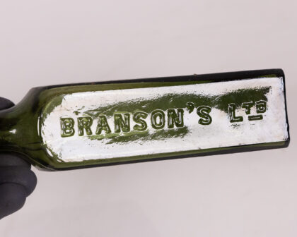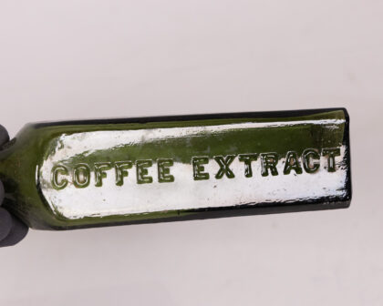 A vintage Branson's LTD coffee extract bottle made from olive green glass. The bottle is rectangular with rounded corners and a narrow neck. Embossed lettering on the side reads "BRANSON'S LTD" and "COFFEE EXTRACT". This bottle would make a charming addition to a collection of vintage bottles or apothecary items, or as a decorative accent in a vintage-inspired kitchen or home. It is in excellent condition for its age.