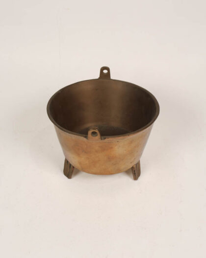 This is a vintage cast brass cauldron, featuring three sturdy tripod legs and two handles for easy carrying. The cauldron has a simple, functional design. The brass has a rich, golden-brown colour with a patina of age that adds to its charm. The interior of the cauldron shows signs of use. Perfect for display in a kitchen or garden, or it could be repurposed as a unique planter.