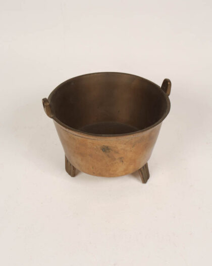 Vintage cast brass cauldron with three legs and two handles. Wear and patina consistent with age. Perfect for display or use as a plant pot.