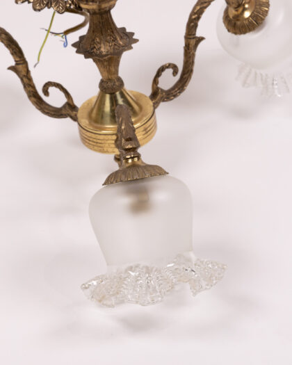 Elegant vintage chandelier featuring a gold-toned metal frame and three frosted glass shades with ruffled clear glass edging. The ornate metalwork and bell-shaped shades add a touch of vintage charm to any space. Some wear commensurate with age is apparent on the metalwork, but this does not detract from the overall beauty of the light fitting. Wiring requires attention from a qualified electrician before use. This chandelier is certain to become a focal point wherever it is installed, offering both ambient lighting and vintage style.