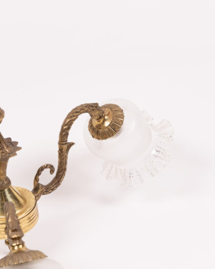Elegant vintage chandelier featuring a gold-toned metal frame and three frosted glass shades with ruffled clear glass edging. The ornate metalwork and bell-shaped shades add a touch of vintage charm to any space. Some wear commensurate with age is apparent on the metalwork, but this does not detract from the overall beauty of the light fitting. Wiring requires attention from a qualified electrician before use. This chandelier is certain to become a focal point wherever it is installed, offering both ambient lighting and vintage style.