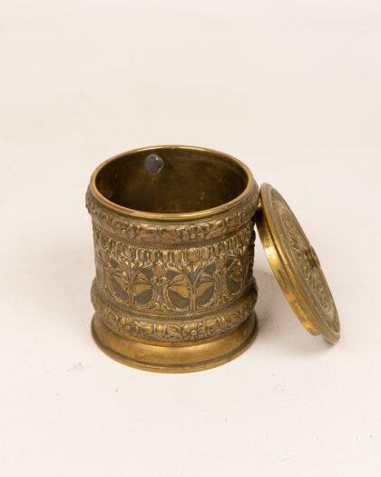 This vintage brass container is adorned with intricate floral and geometric patterns, making it a perfect decorative piece for any home. The container is cylindrical in shape with a removable lid, ideal for storing small items or simply as a display piece. Its antique finish adds a rustic charm, and its sturdy construction ensures durability. Perfect for collectors of vintage brassware or as a unique gift.