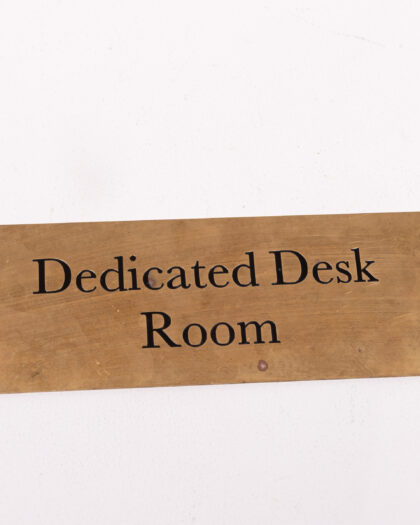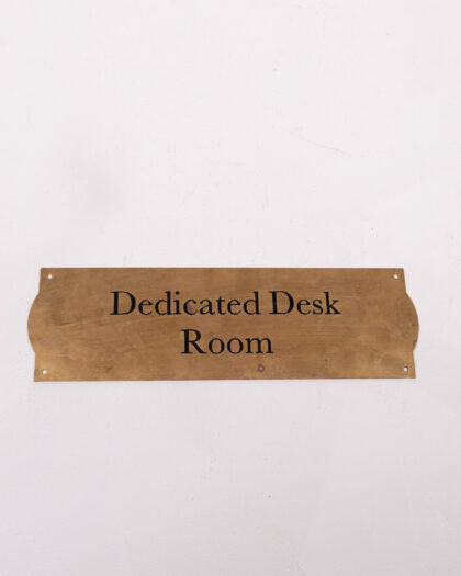 This is a vintage brass sign that reads "Dedicated Desk Room" in black lettering. The sign has a decorative shape and three holes for mounting. A charming piece of decor for a home office, study, or dedicated workspace. The sign is made of solid brass. Ideal gift for adding character to a workspace. In good condition considering its age.