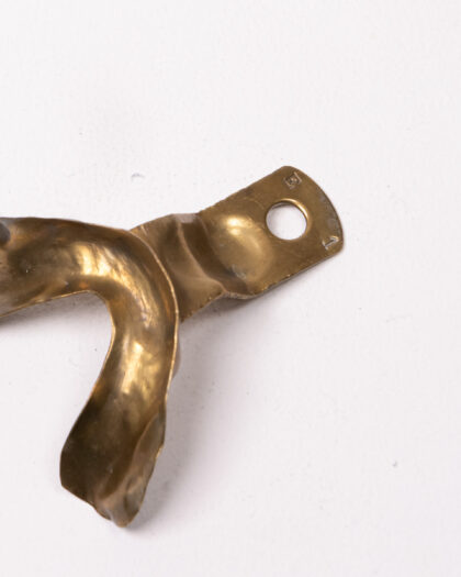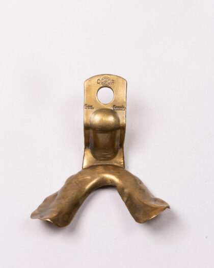 This is a vintage brass dental impression tray, bearing the logo of 'Cozodip' and the word 'Gesch'. This historical piece of dental equipment has an interesting form. It shows signs of age, which enhances its authenticity and appeal. This unique medical antique would make a conversation starter in a study, living room, or even a quirky bathroom display.