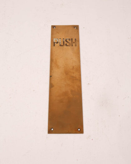 Vintage solid brass door push plate. Features 'Push' lettering. Surface patina and wear consistent with age. Great industrial decor piece.