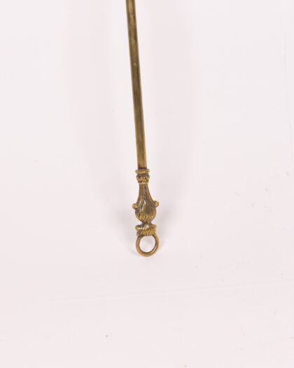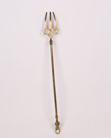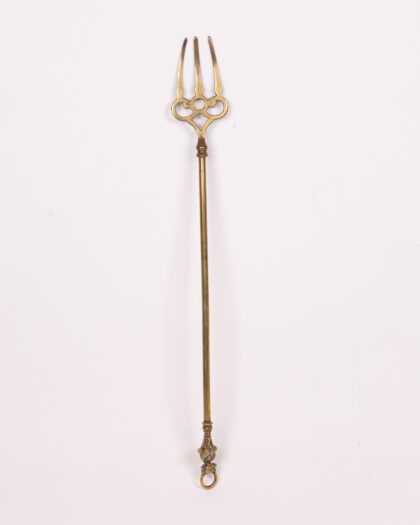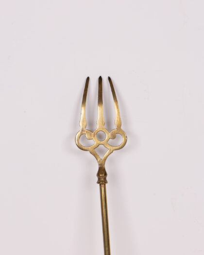 Elegant vintage brass fire poker featuring an ornate trident head, perfect for decorative display by an open fire or as a unique accent in your home.