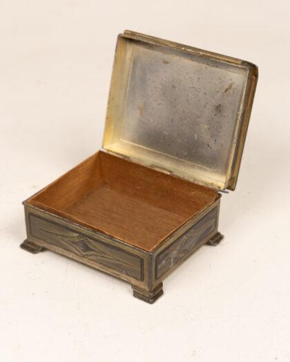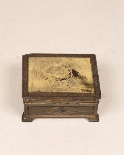 This vintage brass jewelry box features ornate engravings and a slightly tarnished finish, adding to its antique charm. The box is ideal for storing small trinkets or jewelry and would make a perfect decorative piece for any dresser or shelf. Its compact size makes it versatile for various uses and easy to fit into any space. Please note some wear consistent with age.