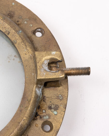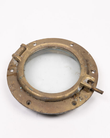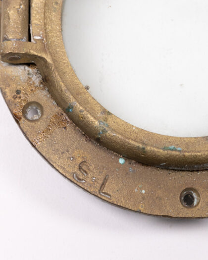 This is a vintage brass maritime porthole window, featuring the markings "S.L". The porthole features a thick glass window, set within a solid brass frame with hinges and a screw closure mechanism. The brass has a lovely aged patina with some verdigris in places, typical of marine environments. The porthole has a distinct nautical aesthetic. Perfect for collectors or as a unique piece of maritime-themed decor.