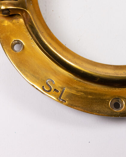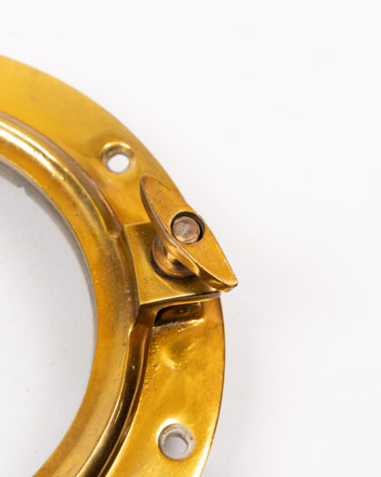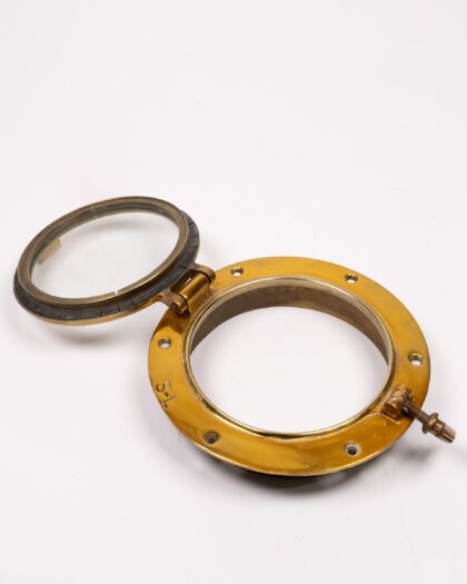 This is a vintage brass porthole window. It is made from brass and glass, with a hinged window that can be opened and closed. The porthole has a lovely aged patina, adding to its vintage charm. It would make a great nautical themed decoration for a home, bar, or restaurant.
