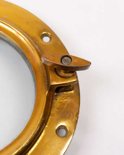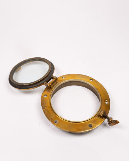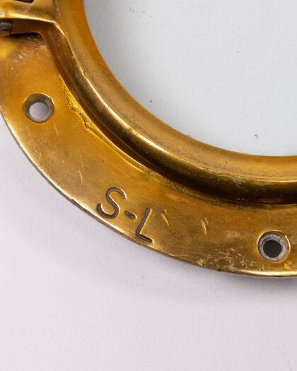 This is a vintage brass porthole, marked S-L, featuring a clear glass window. The porthole is made of solid brass and has a hinged opening with a thumbscrew for closure. It exhibits some signs of age and wear, consistent with its vintage nature, adding to its character and charm. A lovely maritime collectable item.