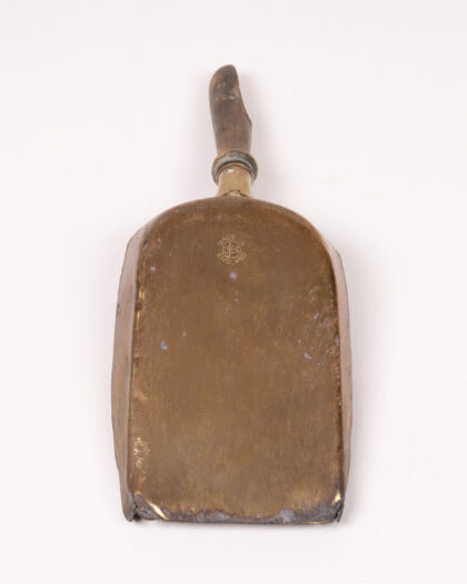 This is a vintage scoop, made of brass, with a damaged wooden handle. It is tarnished with age. This could be used as a decorative item for the kitchen or home bar. It has a stamp on it but it is difficult to read. It says Made in England. There is a small split in the wood at the end of the handle, and the brass scoop has some discolouration.