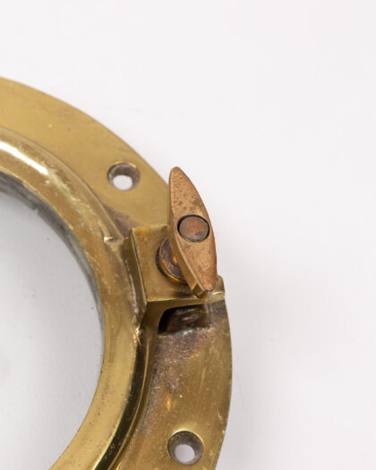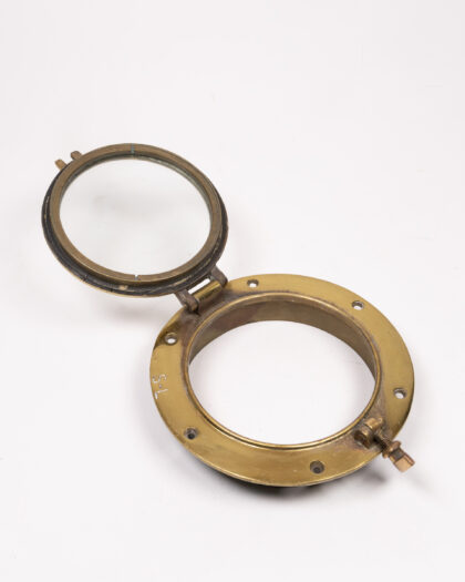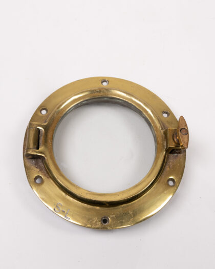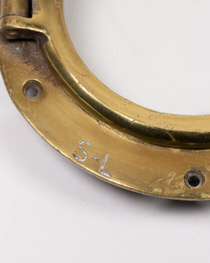 This is a vintage brass porthole salvaged from a ship. The porthole is made of solid brass with a glass window. It has a clasp that is used to secure the window and has 'S-L' etched onto the frame. This piece would add nautical charm to any space. It is in good condition, with some signs of wear and oxidation to the brass. This is common for an item of this age and material. It's a great decorative item for a nautical-themed home or bar.
