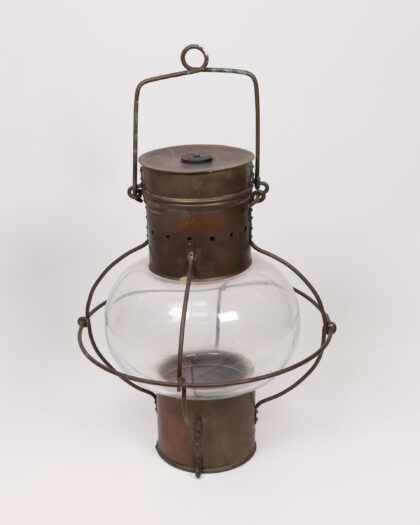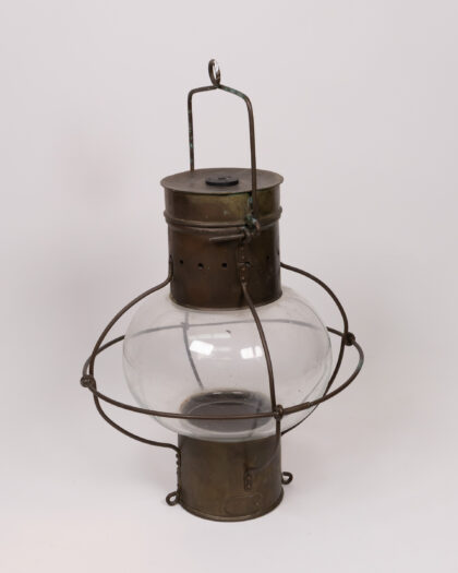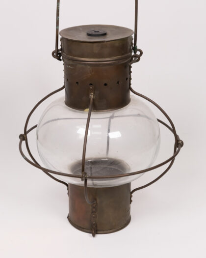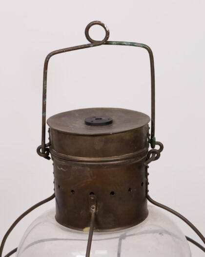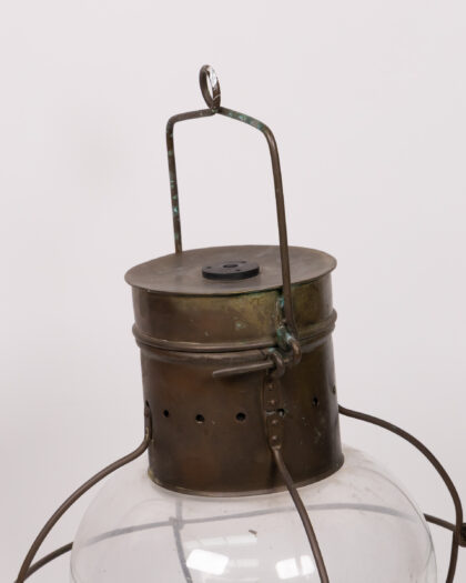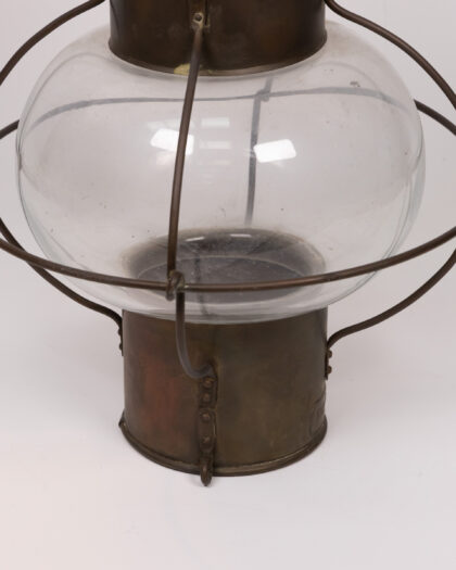 Vintage ship's lantern with a clear glass globe, brass fittings. Good condition for age, signs of wear adding to its charm.