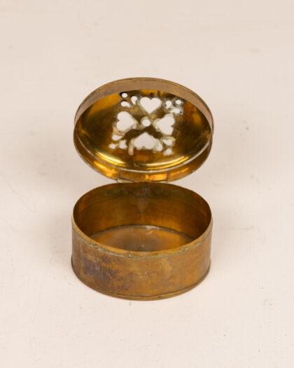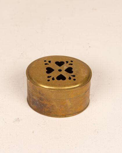 A charming vintage brass trinket box with heart-shaped cutouts on the lid.
