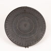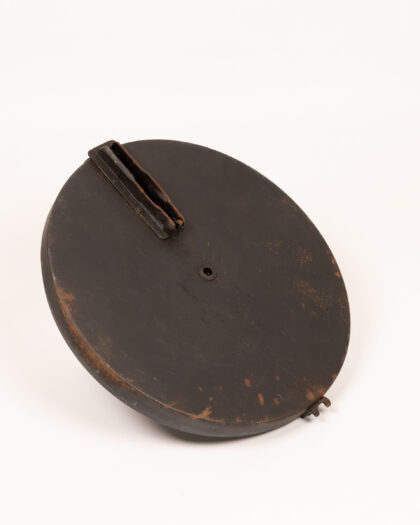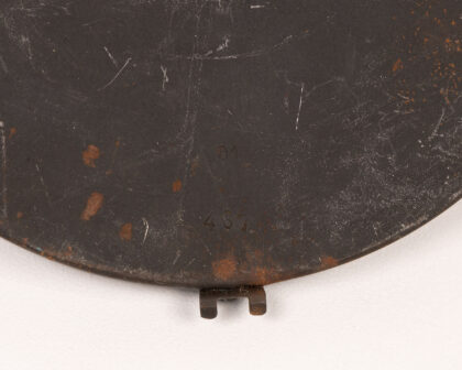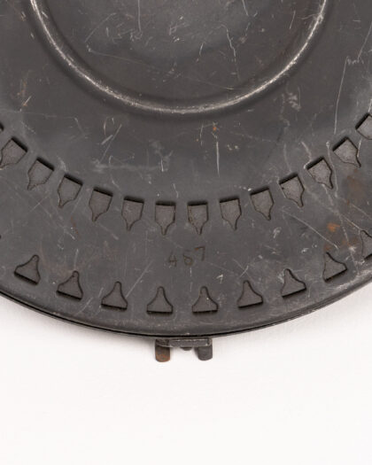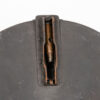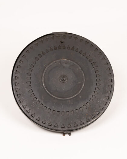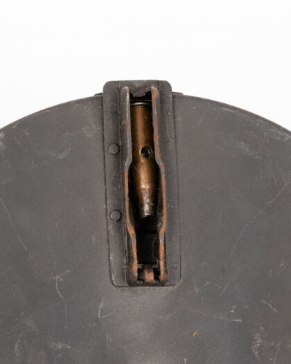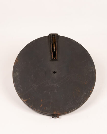Original vintage Bren gun magazine. Shows signs of wear consistent with age and use, including scratches, rust spots, and patina. Features a distinctive circular shape and design with cartridge impressions. Numbers ’01’ and ‘467’ are imprinted on the magazine. This item is a unique military collectible.