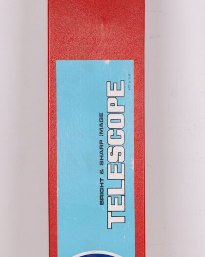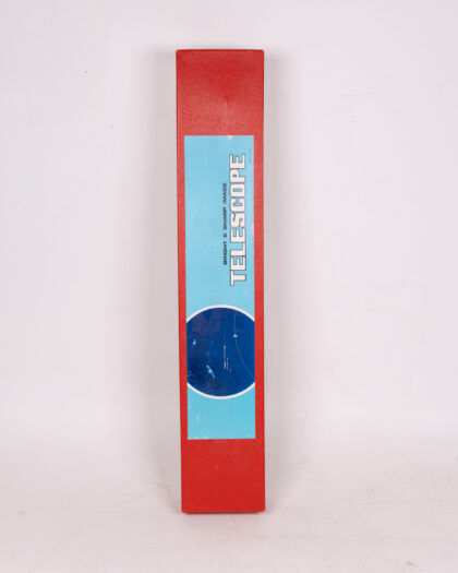 This is a vintage telescope, still in its original box. The telescope itself is primarily white with black accents and comes with a chrome tripod. Included in the box are the original instructions and promotional material. The box is red with a light blue label and shows some signs of wear consistent with age. The overall condition appears to be good, considering its age, but it is being sold as a collectible item.