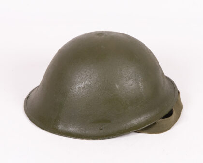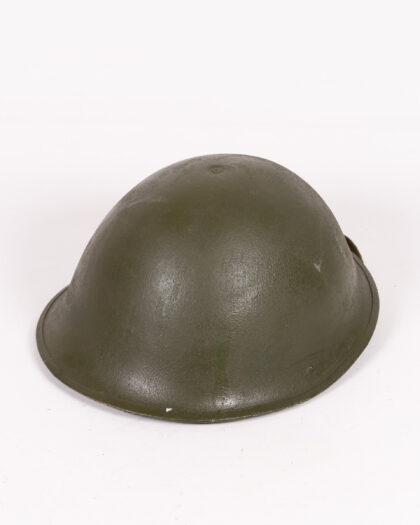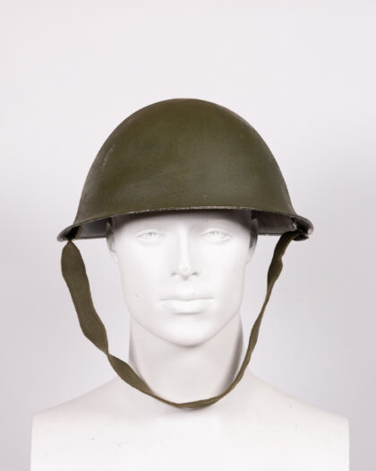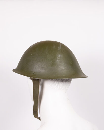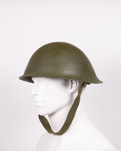 Original vintage British Army helmet with textured green finish and canvas chinstrap. A great piece of military history.