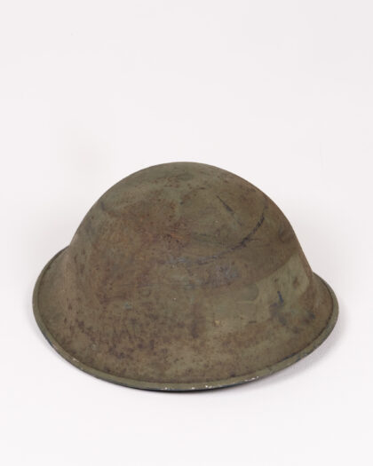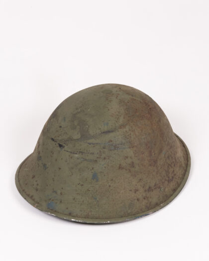 This vintage British military turtle helmet is constructed from steel and features its original green paint. The paint has aged and weathered, giving the helmet a rugged, authentic appearance. The helmet is a tangible piece of military history, perfect for collectors or as a decorative item for those with an interest in military history. Some wear consistent with age, as pictured, adding to its unique vintage appeal. A fascinating piece of memorabilia.