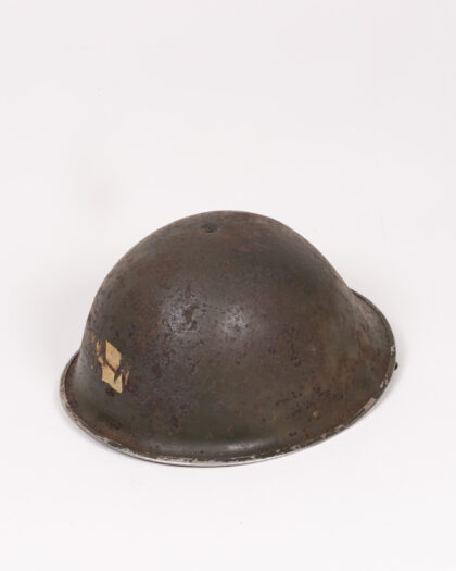 This vintage British steel military turtle helmet with chin strap is a great find for collectors of military memorabilia. The helmet has its original colour, with a silver trim. It has a strap to fit the helmet onto the user. There are some signs of wear consistent with age and use, adding to its authenticity. This helmet is a great piece of military history and would make a great addition to any collection or as a unique display item.