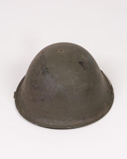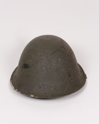 Original British military turtle helmet made of steel. Shows signs of age and wear adding to its authentic vintage appeal.