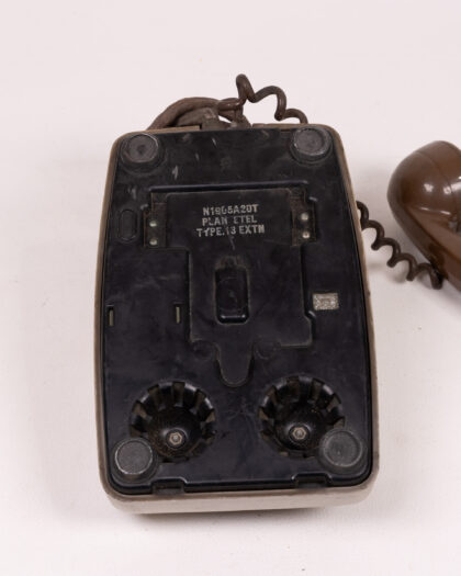 This is a vintage rotary dial telephone. The main body is a beige/grey colour, with a darker brown handset and dial. The dial features numbers and letters around the outside and a central number. The cord is a twisted, coiled style in brown. The telephone shows some signs of age and use, with some marks and wear on the surface. The base has manufacturing and specification details. Overall, this vintage telephone adds a touch of retro charm to any space.