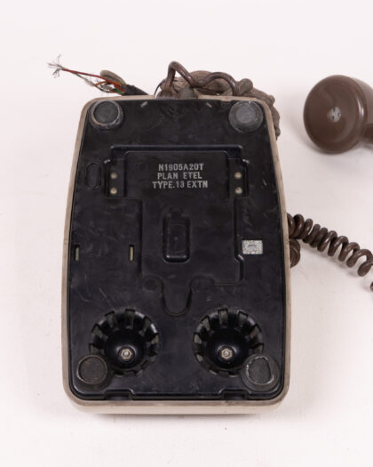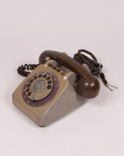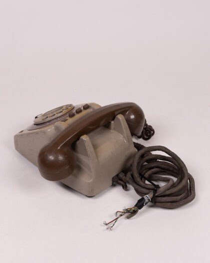 Vintage, rotary dial telephone. The main colours are brown and beige. The handset is dark brown, with a curly lead. The dial has a brown and beige face. There is some discolouration and marks from use. The wire has been cut.