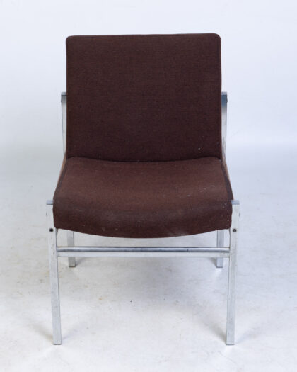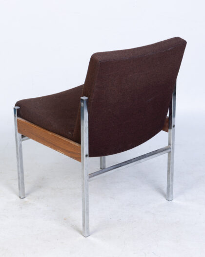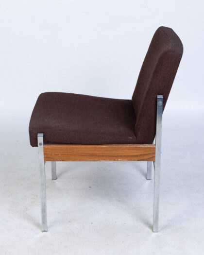Discover this stylish Vintage Mid-Century side chair, a testament to sleek, minimalist design. Featuring a rich brown fabric seat and backrest, it is beautifully complemented by a sturdy wooden frame and polished aluminium legs. This versatile chair embodies timeless mid-century charm, making it a perfect addition to various interiors, from a contemporary living room to a functional home office or a classic dining space. The construction is robust and designed to last. While the fabric shows some natural wear consistent with its age, it remains intact and contributes to the chair's authentic character. Its overall good condition ensures it's ready to bring a touch of vintage elegance to your home.