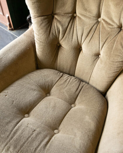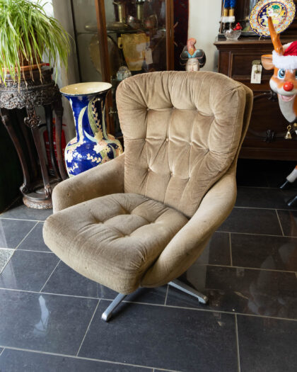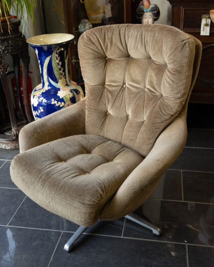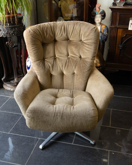 Vintage armchair featuring a swivel base and brown buttoned fabric upholstery. This comfortable chair would be at home in a living room or study. The seat and back are generously padded. The chair is in good vintage condition, showing some wear consistent with its age. The swivel mechanism functions smoothly. A stylish and comfortable addition to any home.