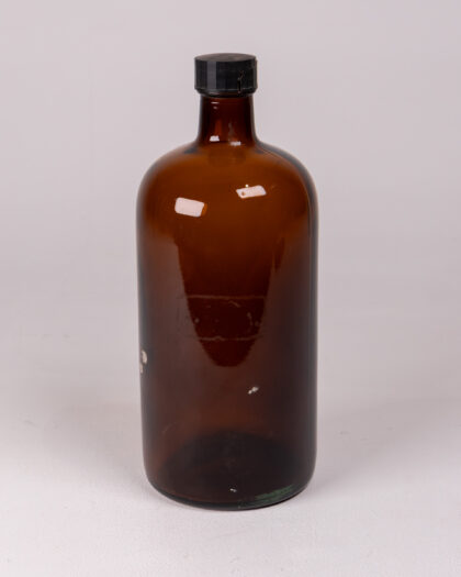 Collectible vintage brown glass apothecary bottle with original black screw lid. Ideal for home decor or curio displays.