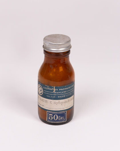 This is a vintage pharmaceutical bottle, likely from the mid-20th century. The bottle is made of brown glass with a metal screw-top lid. The label is predominantly blue and white, featuring the name of the French pharmaceutical company 'Cooperation Pharmaceutique Francaise' and the product 'Vitamine K Hydrosoluble'. The label indicates a quantity of '50 GRS.' The bottle shows signs of age, with some wear and slight discoloration. It would be a great addition to a collection of medical or scientific memorabilia.
