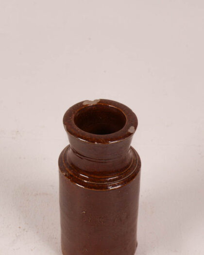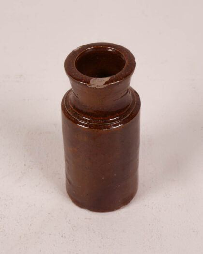 A vintage brown stoneware jar 5" with glazed finish and ringed neck. Signs of age and wear. Ideal for displaying dried flowers or as a decorative piece.