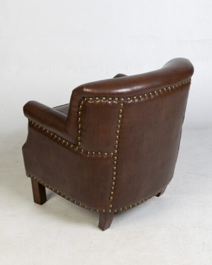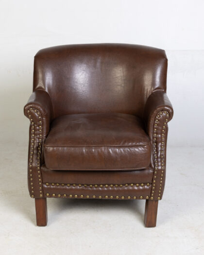 Vintage brown leather armchair with brass stud details. Comfortable and stylish, perfect for adding a touch of vintage charm to any room.