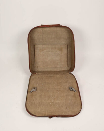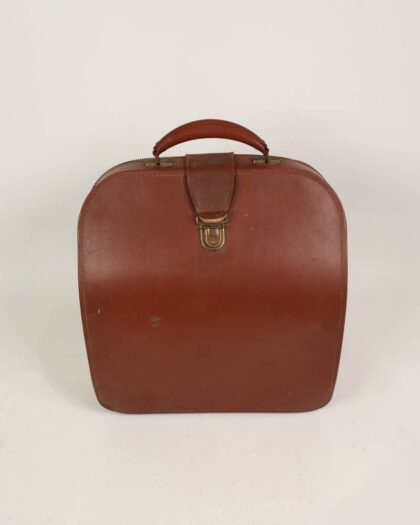This is a vintage brown leather vanity case, likely dating from the mid-20th century. The case features a rounded, rectangular design with a leather exterior and a fabric-lined interior. The leather is a rich brown colour, showing signs of wear and age that give it a unique character. The case is secured with a brass clasp and features a leather carrying handle. The interior is lined with a beige fabric, with marks and stains present. The hardware is mostly brass in colour. This vanity case could be used for storage, display, or as a prop. It would be perfect for a vintage-themed bedroom, dressing room, or living room.