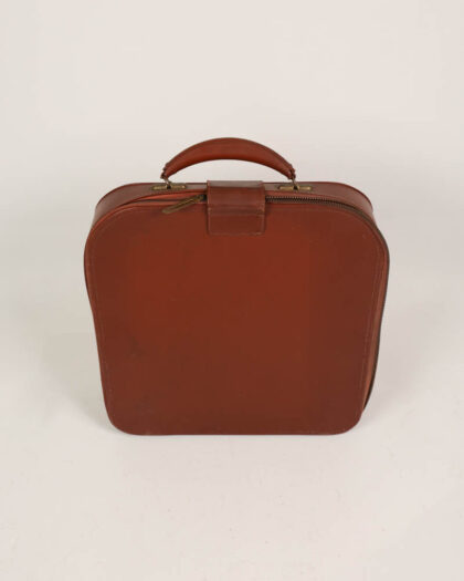 Vintage brown leather vanity case with brass hardware and fabric lining. Shows signs of wear, adding to its vintage appeal. Ideal for storage or display.