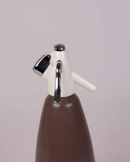 Vintage brown syphon soda bottle with white plastic top and chrome spout and handle. Decorative square design around the base.