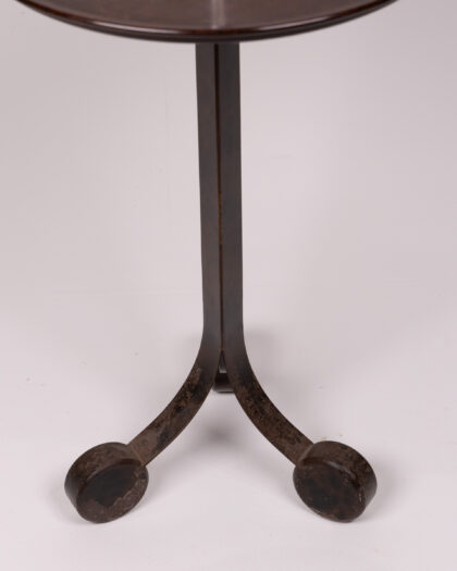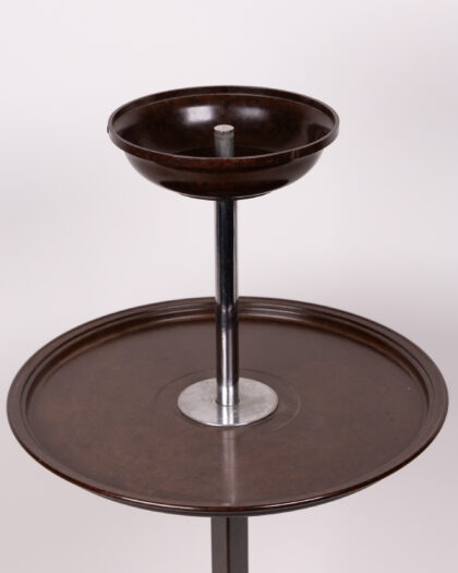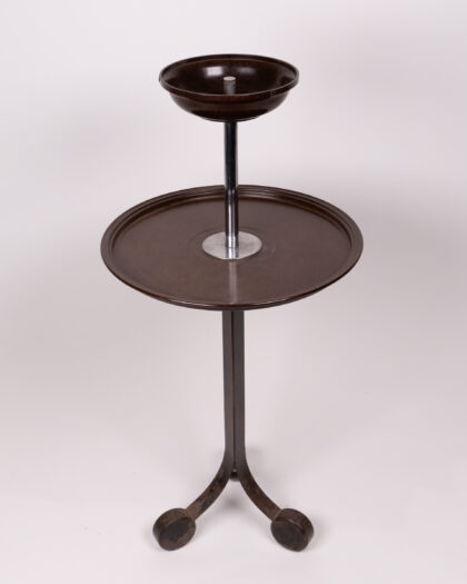 Discover this elegant vintage two-tiered side table, a perfect blend of style and practicality. Its design, featuring a central chrome column and rich brown tiers, evokes the sophisticated aesthetic of the Art Deco era. The round top tier is ideally sized for holding beverages or displaying cherished decorative items, while the lower tray-style tier offers additional functional space. Built with a sturdy metal frame and standing on three distinct rounded feet, this table provides both stability and a unique visual appeal. It is presented in good vintage condition, with charming signs of wear that are consistent with its age, adding to its authentic character and story.