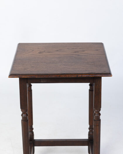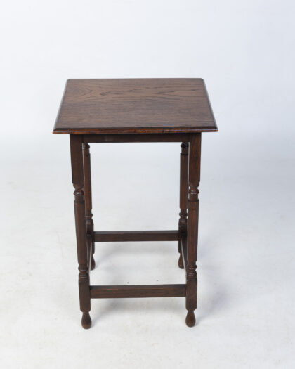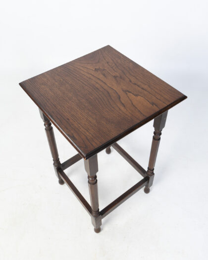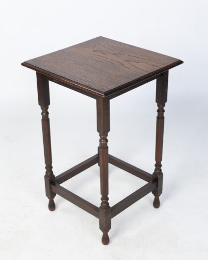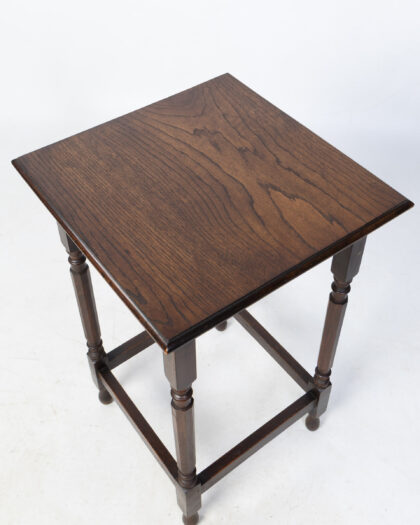 This is a vintage wooden side table. The table has a square top with a simple, clean design. The table legs feature decorative elements, adding a touch of detail to the overall aesthetic. The rich brown colour of the wood enhances the table's vintage charm. In good condition, this side table is a practical and stylish addition to any living space, offering a convenient surface for lamps, books, or decorative items.