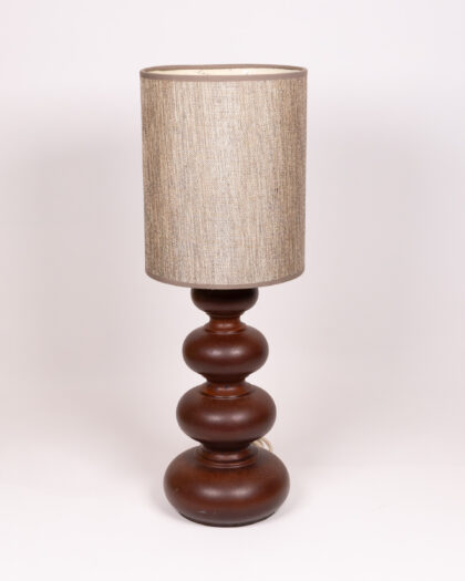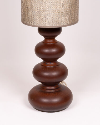 This is a vintage table lamp with a ceramic base featuring a series of rounded shapes stacked on top of each other, painted in brown. The lamp has a simple, straight-sided grey shade. It would make a lovely addition to a living room or bedroom. The lamp is in good condition, with only minor signs of wear and tear to the base.